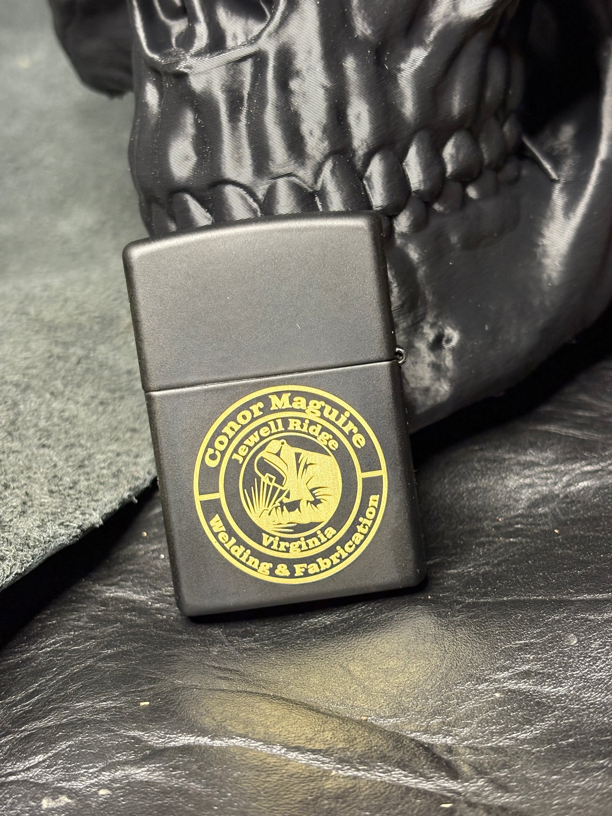 Custom engraved Mad Mick / Conor Maguire Welding Zippo in Matte Black with Zippo molle lighter case in a deluxe Zippo presentation box.
